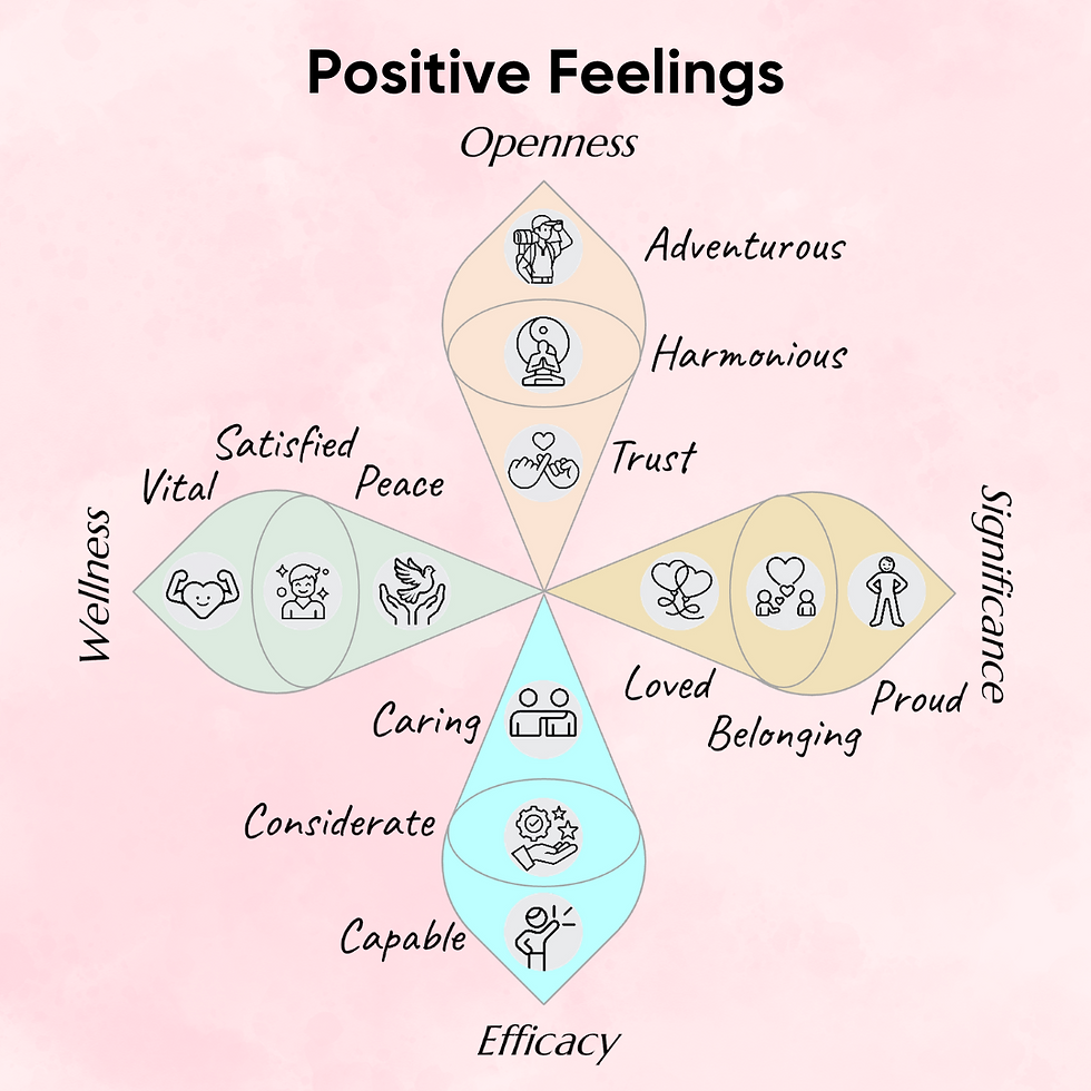Our positive experiences translate into a spectrum of positive feelings, from joyful and excited to calm and content. Feelings like pride, belonging, and love arise when we connect with others meaningfully. Experiencing a sense of efficacy and mastery boosts confidence, while cultivating wellness helps us feel satisfied and at peace. By opening ourselves to new experiences and perspectives, we increase harmony and a sense of trust in ourselves and others. Together, these feelings create a fuller, richer life, where we feel energized, valued, and connected.